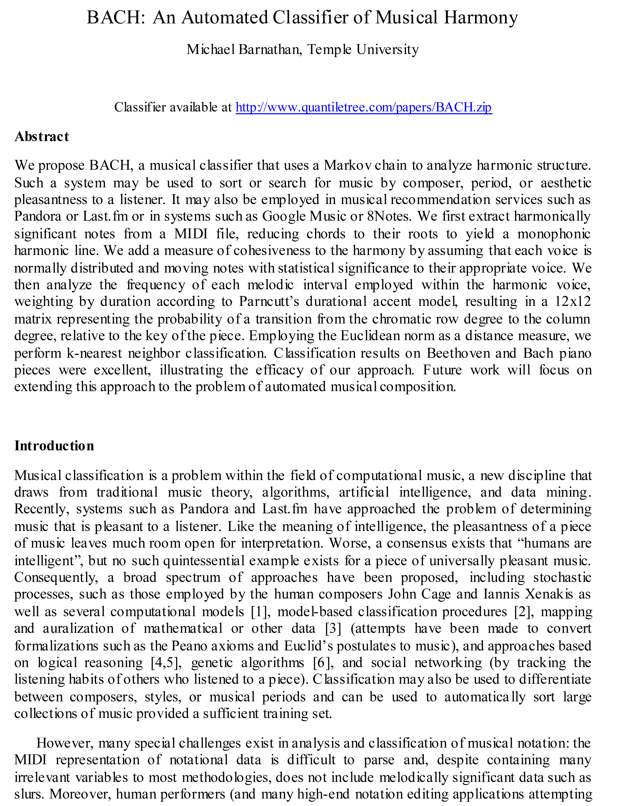 BACHThis is a paper I wrote (in a single day) on a musical classifier I wrote (also in a single day) that attains 75% classification accuracy between Bach and Beethoven solely from the harmony employed in both composers' pieces.