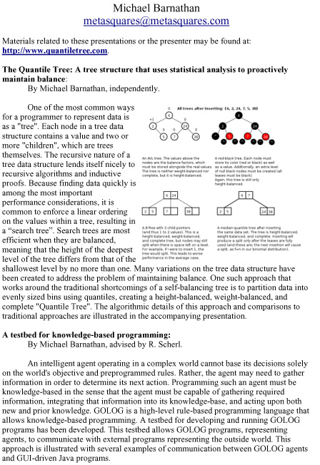 These are materials from the 2005 Science, Technology, and Engineering research conference that I attended. At this conference, I presented the Quantile Tree structure, which this site is named for, and an implementation of a knowledge-based programming platform.