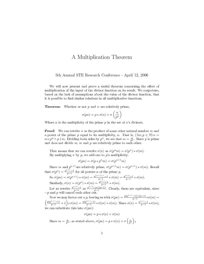 In the autumn of 2005, I decided to explore the realm of pure mathematical research. Six months later, I presented my findings at the 5th Annual STE Conference in a presentation titled "Properties and Applications of the Divisor Function".