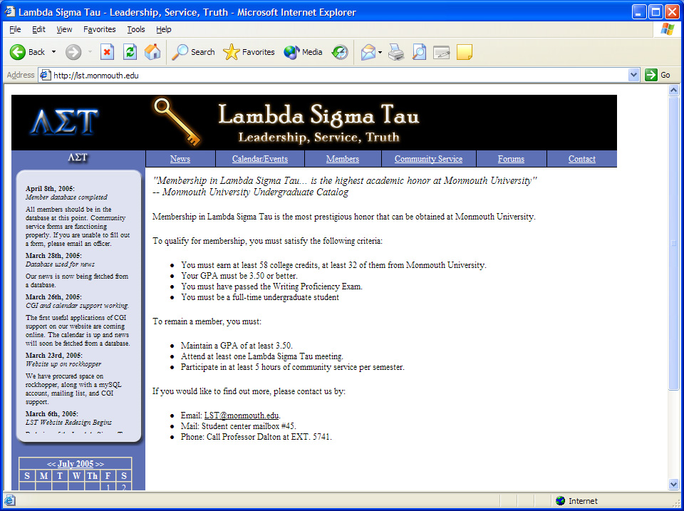 I am also responsible for redesigning and maintaining the official Lambda Sigma Tau website, located at http://lst.monmouth.edu. This site, with the exception of some static content on the homepage, is entirely database driven. Using the backend that I've developed, members can log in to check and update their community service records, officers can modify site preferences and approve community service hours, and the general public can view news and events relating to Lambda Sigma Tau.