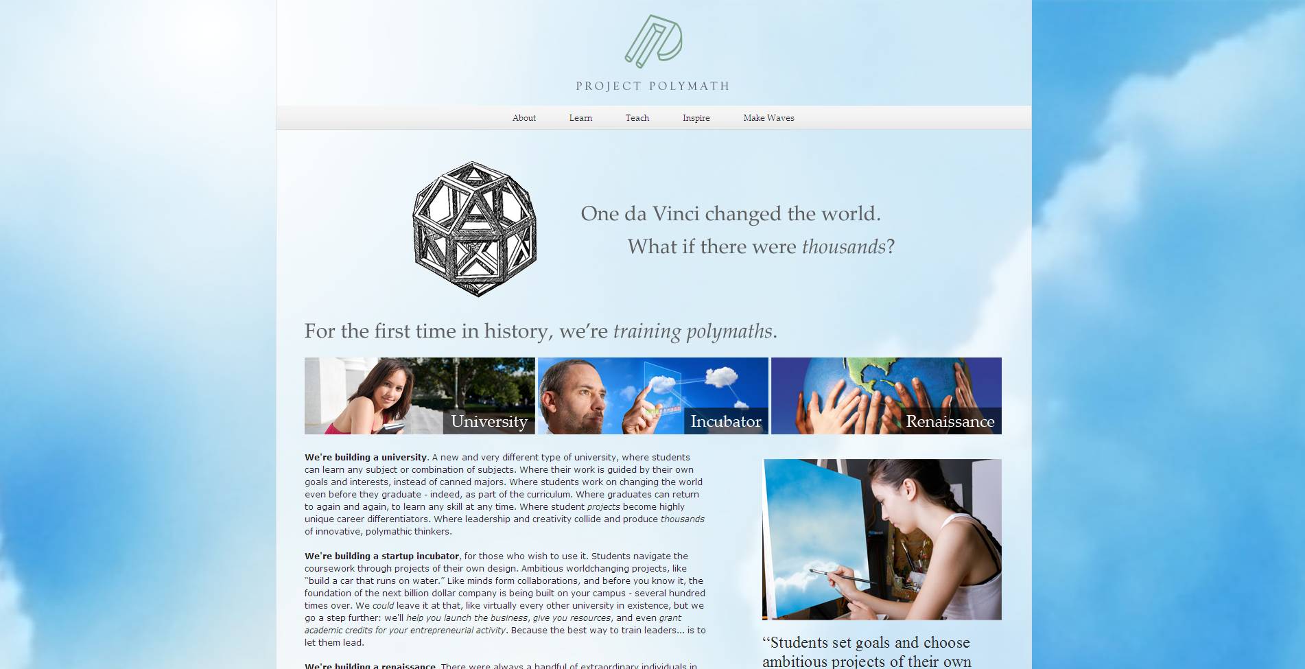Project Polymath is my ambition to start a new type of university that encourages student-driven, simultaneous, and modular learning in multiple fields, as well as instruction in techniques to creatively generate ideas and fuse principles from across disciplines. The idea is to spark a new Renaissance by training an entire generation of polymaths rather than relying upon the rare autodidactic individuals, as was done in the past.