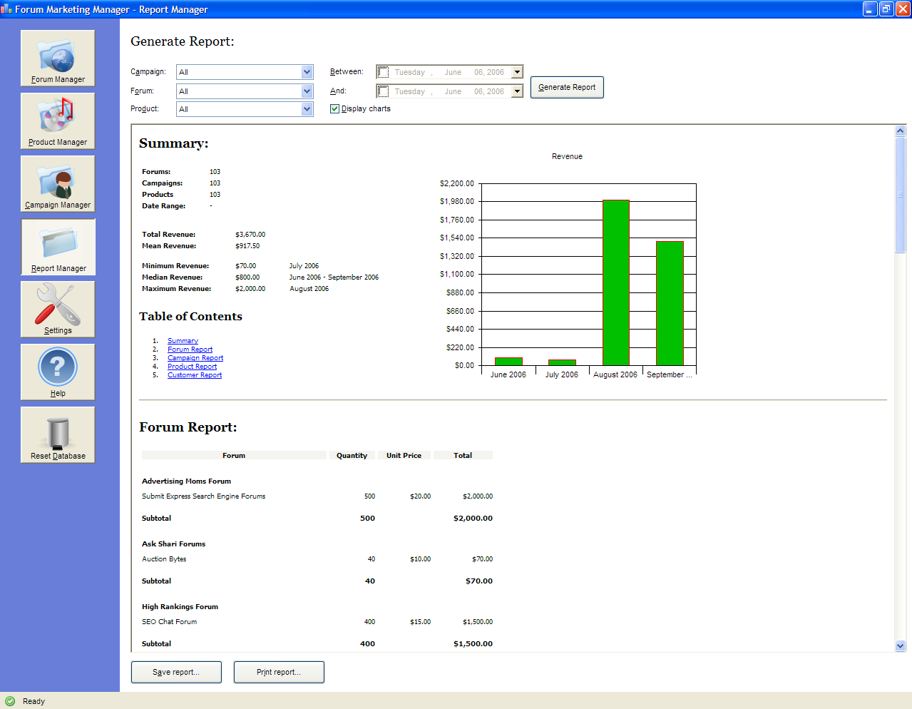 Forum Marketing Manager is exactly what it sounds like - it allows you to manage forum marketing contacts, forums, membership information, campaigns, and customers.