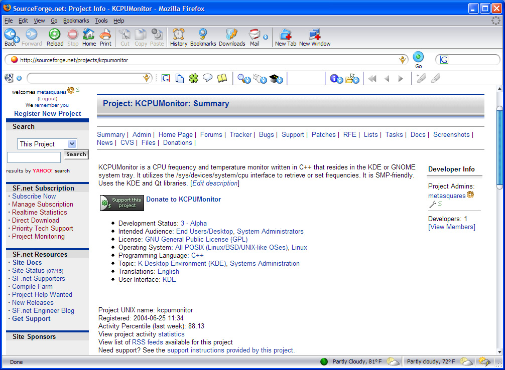 KCPUMonitor was accepted to SourceForge on June 25, 2004. The project files and CVS repository are available there.