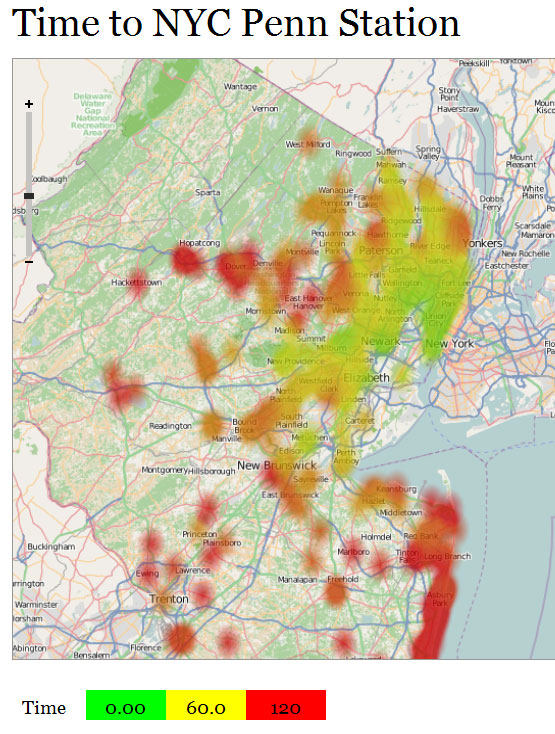 A mashup I made of mass transit commute time to Penn Station from NJ. I want to eventually implement this sort of heatmapping capability directly into Google Maps.