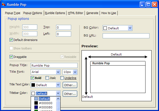 Rumble Pop is a highly versatile popup generator with a twist: It allows the user to create popups that slide and rumble around the screen, optionally making noise while doing so. In addition to these unique features, Rumble Pop supports the creation of fully customizable popups, popunders, and DHTML popovers. The program sports an integrated WYSIWYG HTML editor and HTML syntax highlighting. Unfortunately, as the HTML editor uses IE's DOM to create the page, it does not generate standard XHTML code. This may improve automatically if IE7's browser component becomes more standards-compliant, as the project is dynamically linked with IE.