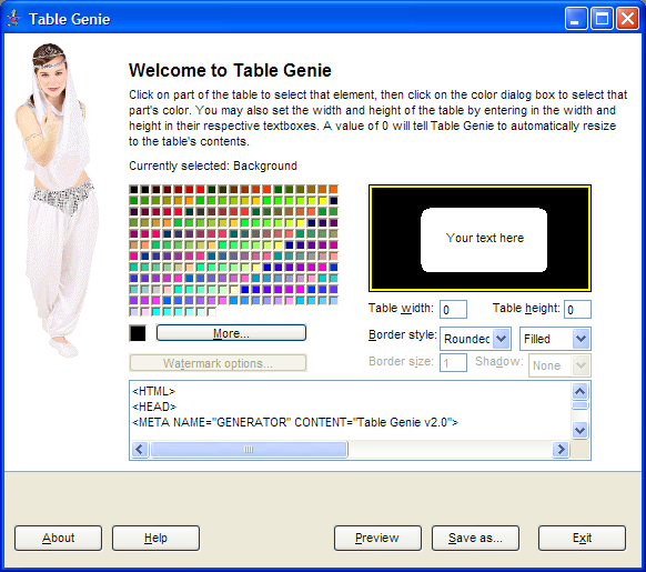 Table Genie is a highly customizable table generator. Table Genie can generate square or round tables with any combination of text, border, and table colors. It can also apply two drop shadow effects (standard and "page", where the table looks like it's peeling off of the background) to a table. The latest version of Table Genie also comes with a highly customizable watermark generator for quick application of a textual or graphical watermark background to a page. Text can be inserted in any font, then embossed, rotated, or alphablended to the user's preferences.