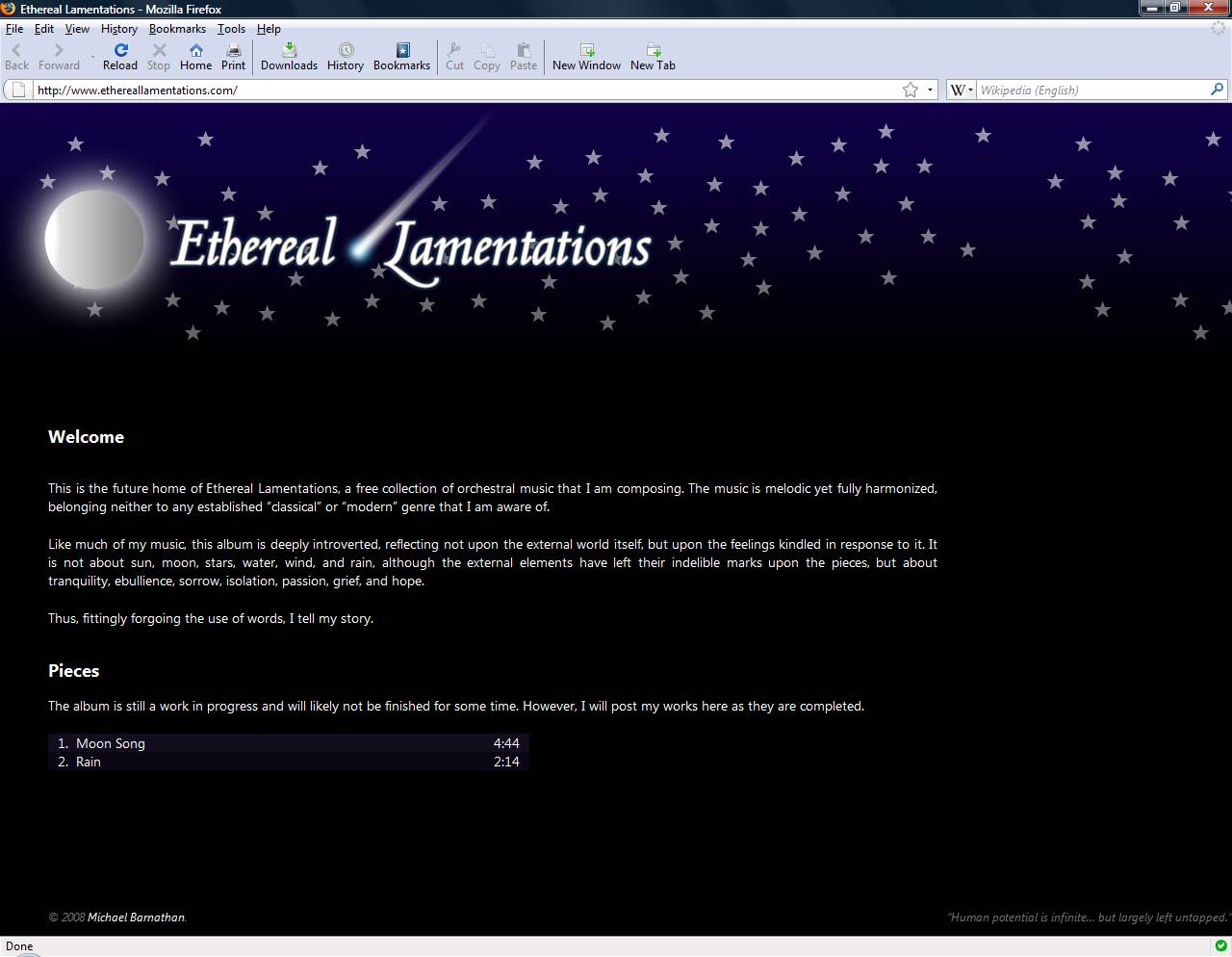 "Ethereal Lamentations" is to be the title of my first musical album. It will likely be in progress for a great deal of time, as I don't have the time I used to have to devote to my music, but I will post new pieces as they are written until the album is complete.