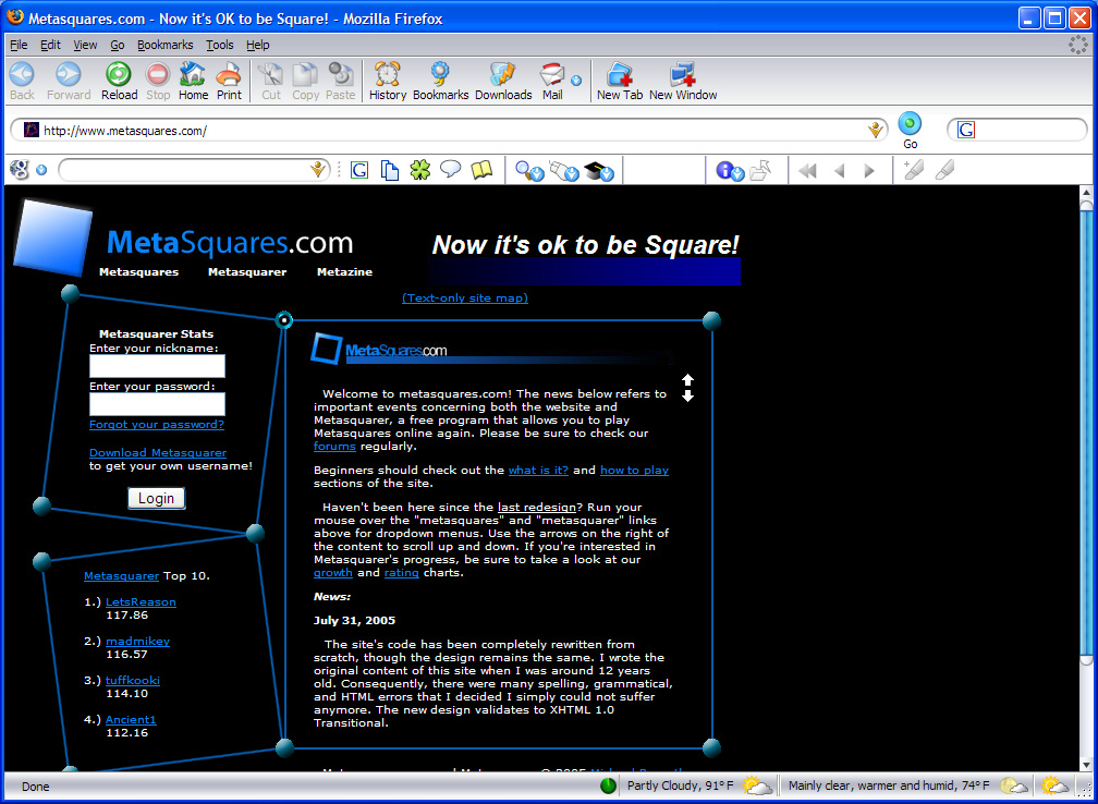 The game's website is metasquares.com. I originally registered this site in 1999; earlier versions of the game were kept on my personal website. The site is built using a Perl/mySQL backend and utilizes some very innovative methods of client/server communication between individual copies of the game and the player database to avoid excessive load. Metasquares.com has won many SiteCritique awards, including "Best overall", "Best graphics", and "Best browser compatibility". This is the first site of note that I designed, though ProgrammerFAQ.com preceded it. I was assisted in creating the latest incarnation of the site by Curt Wallach, an avid Metasquares fan. I rewrote the entire site's code from scratch from July 31, 2005 to August 2, 2005. It is now valid XHTML 1.0.