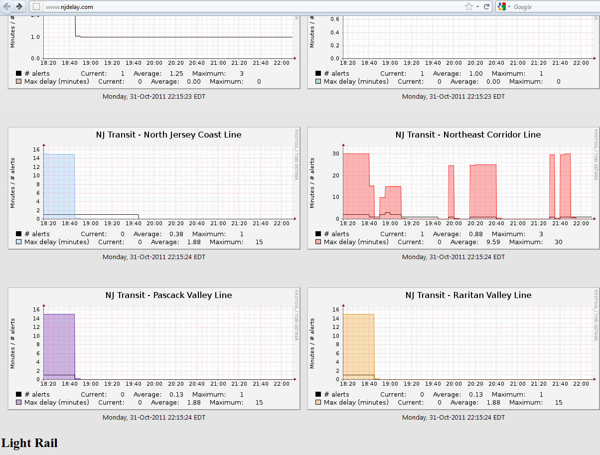 NJDelay is a historical delay and alert tracker for NJTransit buses, trains, and light rail lines. It is built using Cacti, Perl, and SSI coupled with mod_rewrite. Yes, I know Cacti. Yes, well enough to turn a system monitoring tool into something that can parse and plot train delays.