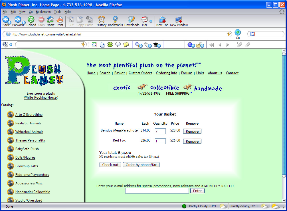 In March of 2005, I was asked to redesign the Plush Planet website and rewrite the very buggy and completely unmanageable backend code that the last web designers to work on the site had written. Though the former code was in PHP, I chose to rewrite the code in Perl, as there was high demand for advanced string parsing on the site. I also took the opportunity to add encryption to the site and SSL-enable the order page, as credit card numbers were previously being sent and stored in plaintext.
