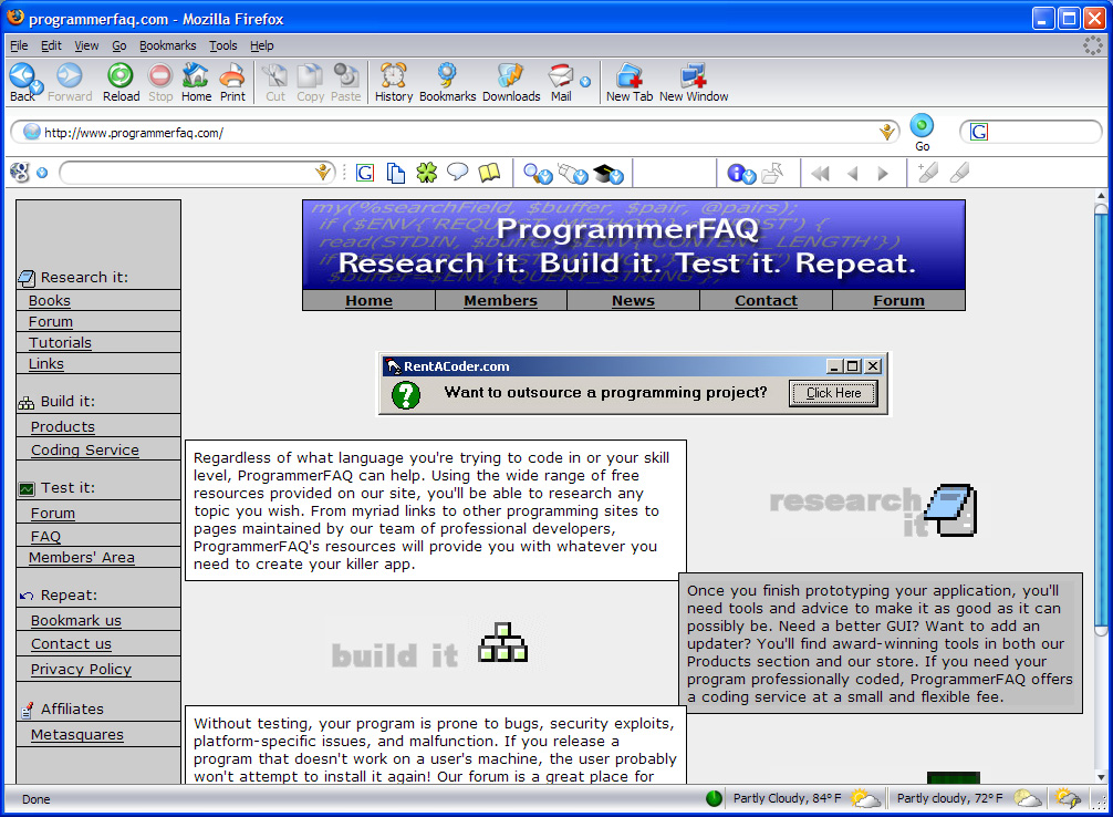 ProgrammerFAQ.com was the second website that I designed, but the first that I retain the record of. This website was designed to be a Q/A community for programmers, largely based upon my own perceived needs as a programmer at the time. Unfortunately, though an ambitious idea, the site failed to gain popularity and was eventually eclipsed by the wildly successful metasquares.com. I keep the site solely for email hosting purposes.