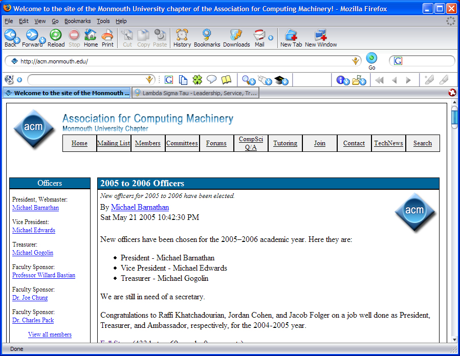 This thumbnail displays the website of the MU ACM Chapter, as I designed it at the beginning of my tenure as Vice President and Webmaster of the chapter (Oct. 2004-May 2005).